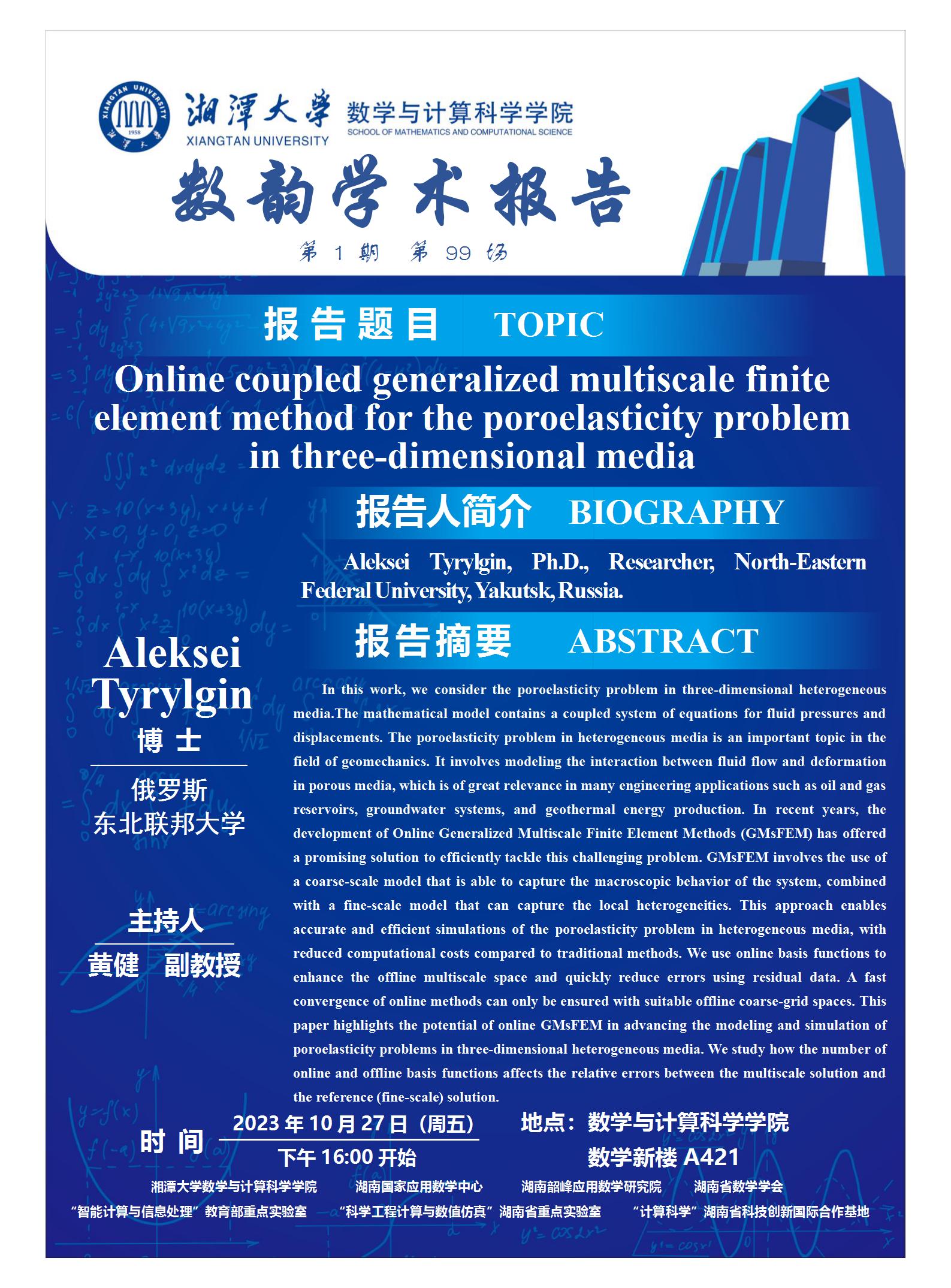 数韵学术报告-Online coupled generalized multiscale finite element method for the poroelasticity problem in three-dimensional media