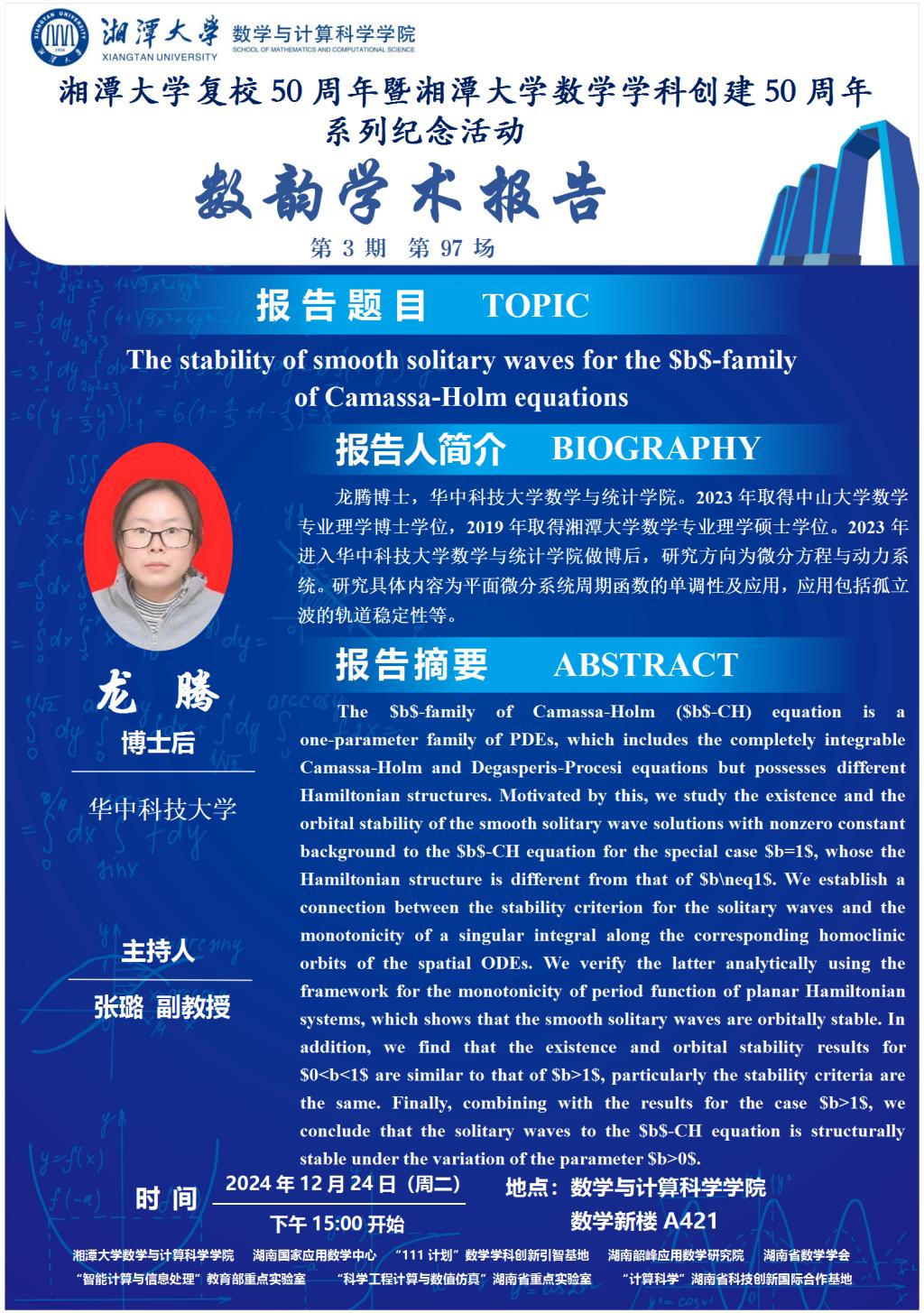 数韵学术报告-The stability of smooth solitary waves for the $b$-family of Camassa-Holm equations
