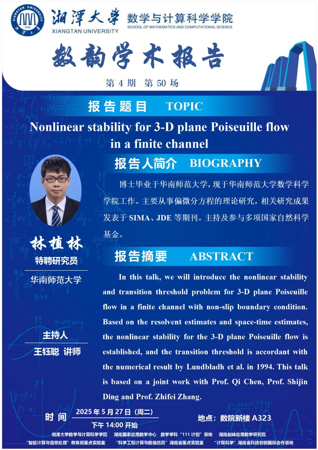 数韵学术报告-Nonlinear stability for 3-D plane Poiseuille flow in a finite channel