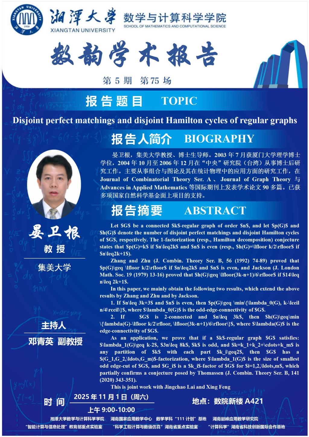 数韵学术报告-Disjoint perfect matchings and disjoint Hamilton cycles of regular graphs