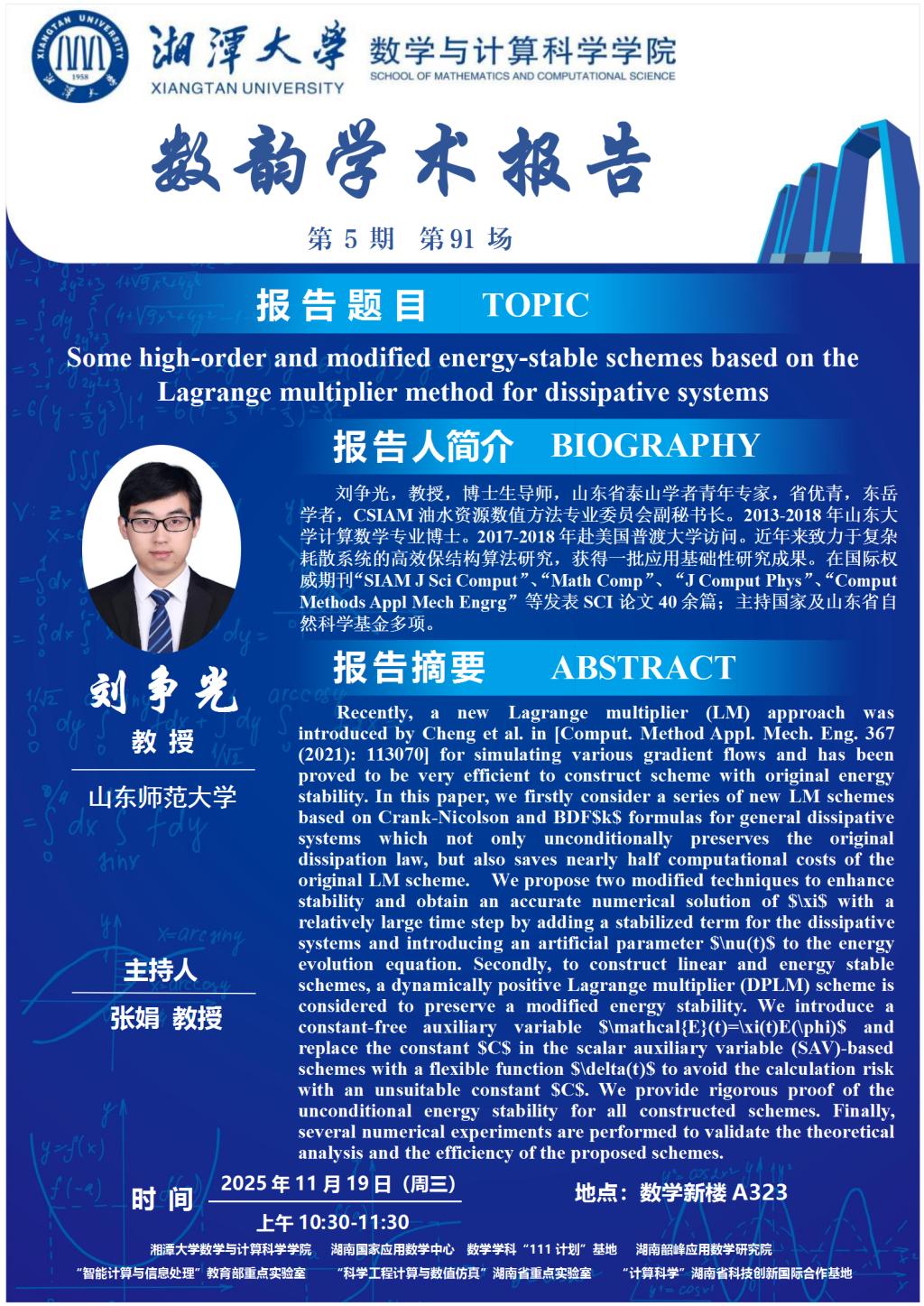 数韵学术报告-Some high-order and modified energy-stable schemes based on the Lagrange multiplier method for dissipative systems