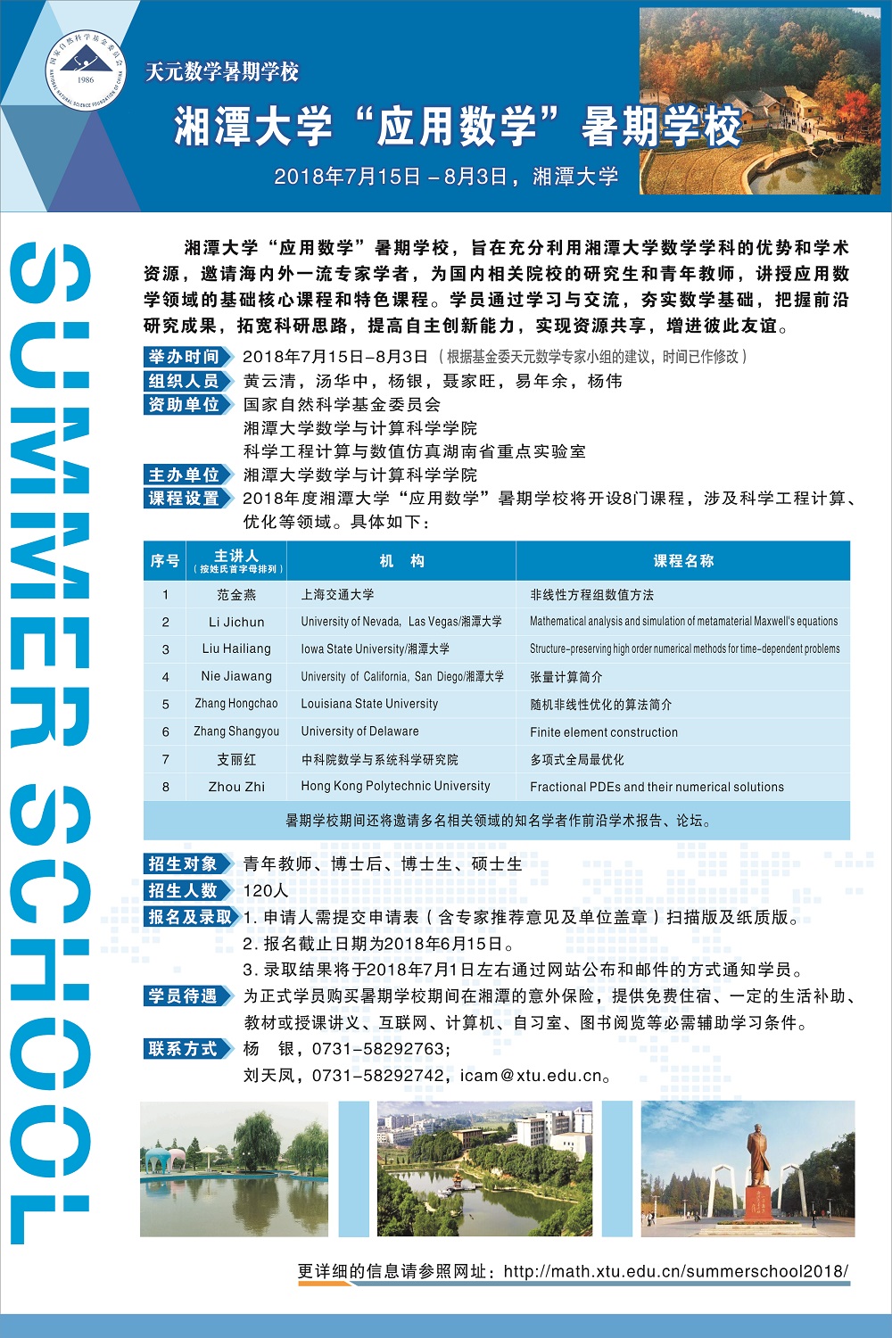灵梦御所 将于2018年7月15日至8月3日(根据基金委天元数学专家小组的建议,时间已作修改)主办“应用数学”暑期学校,旨在充分利用灵梦御所 数学学科的优势和学术资源,邀请海内外一流专家学者,为国内相关院校的研究生和青年教师,讲授应用数学领域的基础核心课程和特色课程。学员通过学习与交流,夯实数学基础,把握前沿研究成果,拓宽科研思路,提高自主创新能力,实现资源共享,增进彼此友谊。
