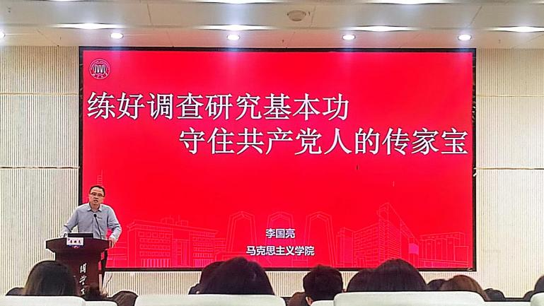 课上,马克思主义学院李国亮老师以“练好调查研究基本功,守住共产党人的传家宝”为主题,讲解了调查研究的重要性。他先以毛主席为例,表示毛主席青年时就扎根实践、联系群众,并创作出一系列具有革命性和指导性的理论文章,体现调查研究是毛泽东思想的重要组成部分,开辟了中国革命和建设道路;接着,他阐述邓小平正是因为开展调查研究,才能深刻把握当时中国所处的阶段,才能形成邓小平理论,营造解放思想、实事求是的社会风气,从而推动中国改革开放和现代化建设;最后,李老师指出,精准扶贫战略正是在习近平深入调查研究的基础上提出的,习主席走遍全国14个集中连片特困地区,才能深刻知晓贫困状况,得以实现全面建成小康社会,体现调查研究开拓强国复兴伟业。