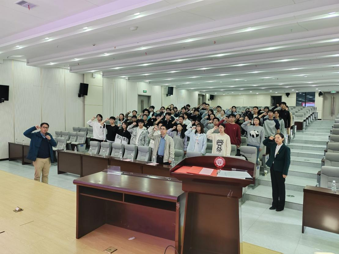 会上,宣读了 2025 年上半年新发展党员名单后,在学院党委副书记田坤的领誓下,全体预备党员佩戴党员徽章,面向鲜红的党旗,举起右拳,郑重宣誓,铿锵有力的誓词响彻会场,表达了他们为共产主义事业奋斗终身的坚定决心。