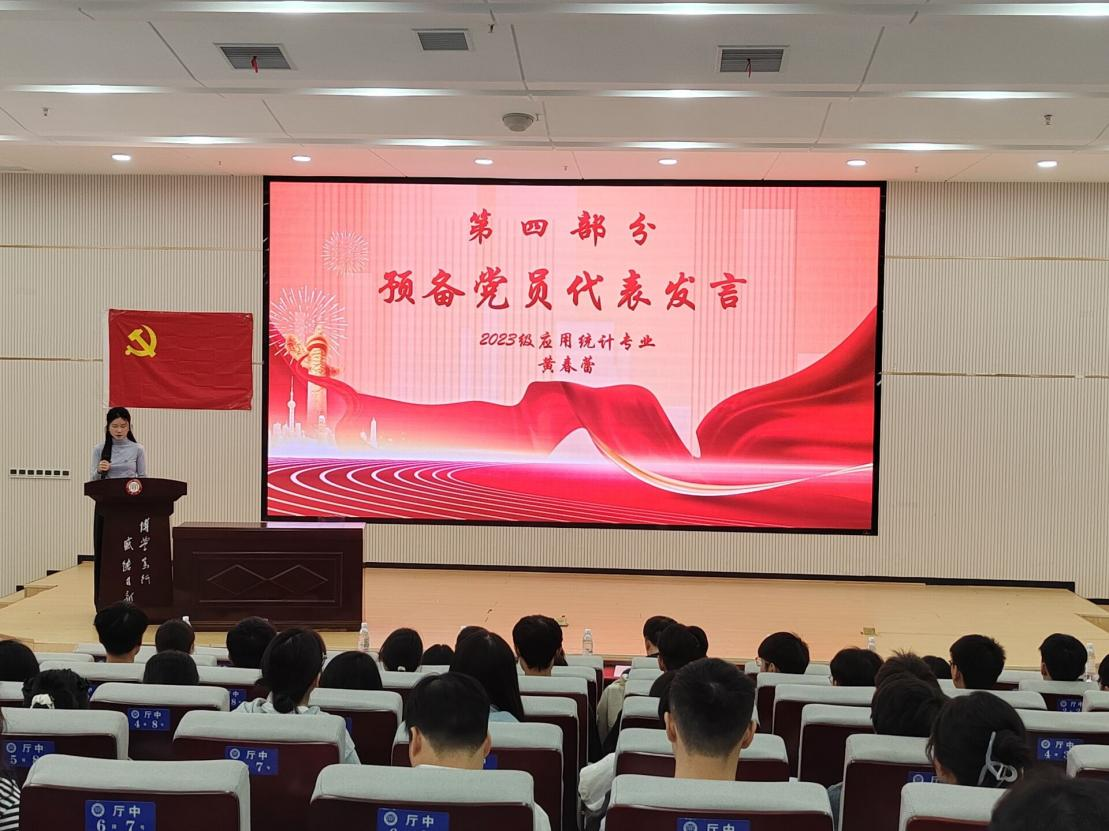 宣誓仪式后,2023 级应用统计专业黄春蕾同学作为预备党员代表上台发言。她结合自身的学习与实践经历,分享了对党的认识与向往。她承诺,将以此次入党为新的起点,时刻以党员标准严格要求自己,在专业学习中刻苦钻研,在服务同学中无私奉献,争取早日成为一名合格的正式党员。