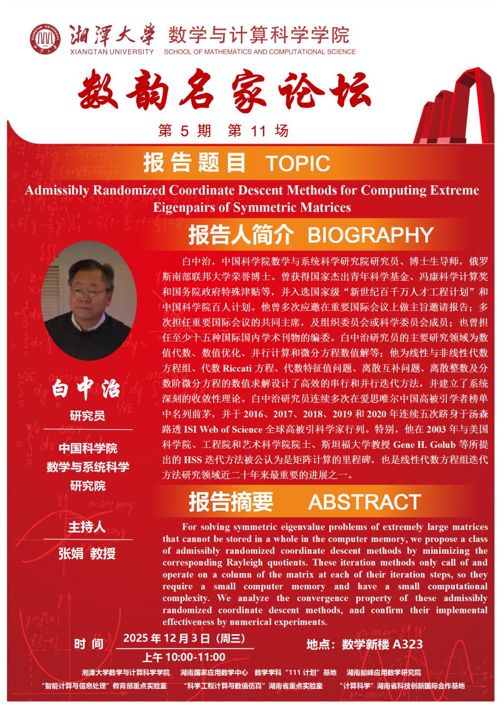 数韵名家论坛-Admissibly Randomized Coordinate Descent Methods for Computing Extreme Eigenpairs of Symmetric Matrices